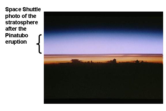 For anyone paying attention back then, the 1991 eruption of Pinatubo produced over one year of milky skies just before sunrise and just after sunset, as the sun lit up the stratospheric aerosols, composed mainly of sulfuric acid. The following photo was taken from the Space Shuttle during this time: