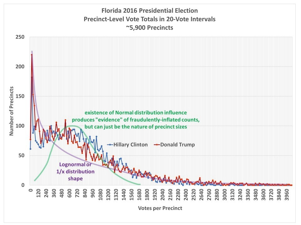 I believe that what is going on in the Florida precinct data is simply a combination of normal and log-normal distributions of the vote totals. So, for a variety of reasons, the vote totals do not follow a log-normal distribution and so cannot be interpreted with Benford’s Law-type analyses.