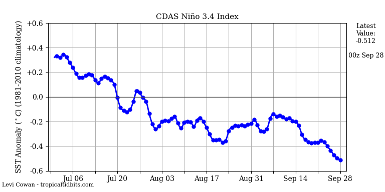 The linear warming trend since January, 1979 has now dropped slightly, at +0.13 C/decade (+0.12 C/decade over the global-averaged oceans, and +0.18 C/decade over global-averaged land).