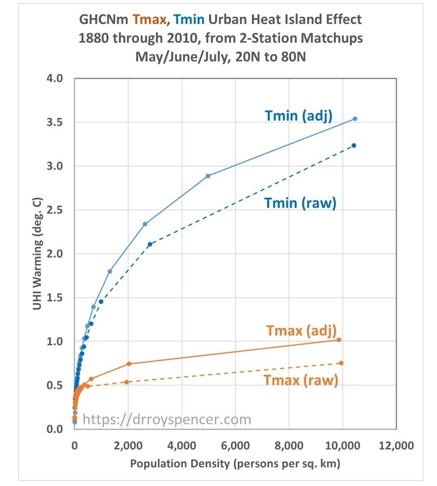 The results (below) show that the total UHI effect in summer for highly-populated stations averages 3.5 times as large in Tmin as it does in Tmax. Each curve is based upon approximately 300,000 monthly 2-station matchups.