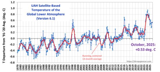 The Version 6.1 global average lower tropospheric temperature (LT) anomaly for October, 2025 was +0.53 deg. C departure from the 1991-2020 mean, unchanged from the September, 2025 value.