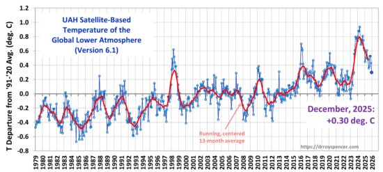 Today’s entry notes that December, 2025 was +0.30 deg. C departure from the 1991-2020 mean. However, the earliest mean, covering the first 20 years of observations (1978-1999) was about 0.22 lower than the current, meaning the departures you report appear smaller because of the use of a later baseline average–otherwise Dec. 2025’s anomaly would be something like .52 Deg C.