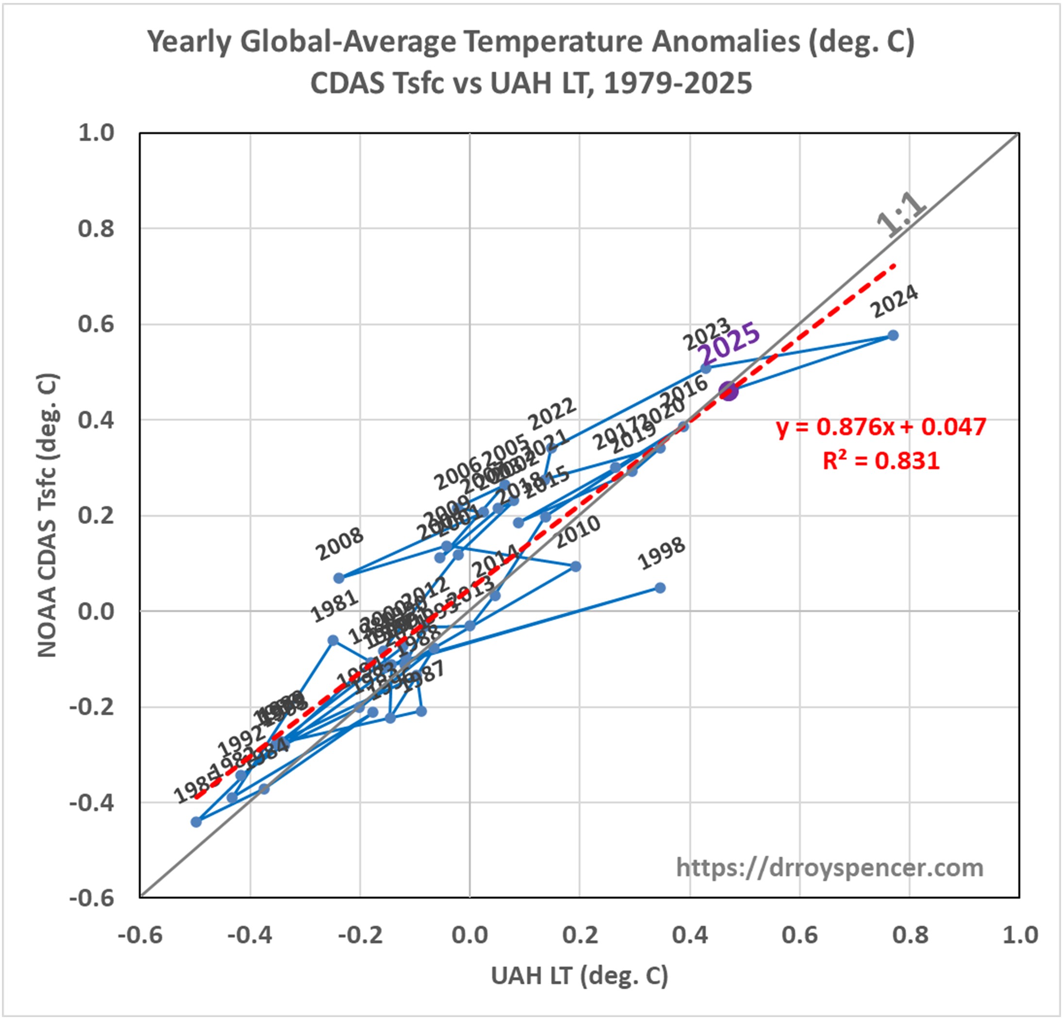 The full UAH Global Temperature Report, along with the LT global gridpoint anomaly map for December, 2025 as well as a global map of the 2025 anomalies and a more detailed analysis by John Christy, should be available within the next several days here.