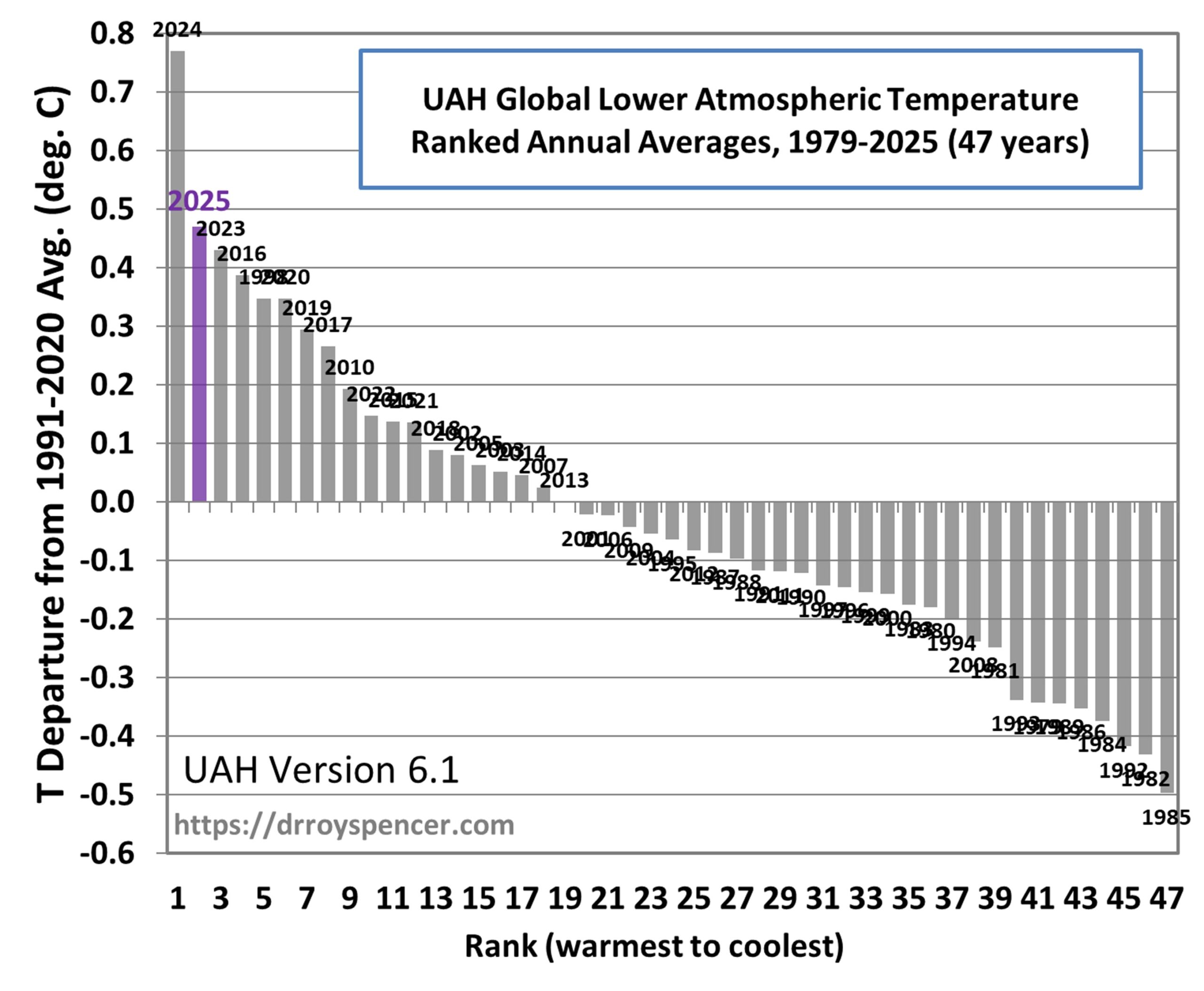 2025 was the 2nd warmest year (a distant 2nd behind 2024) in the 47-year satellite record